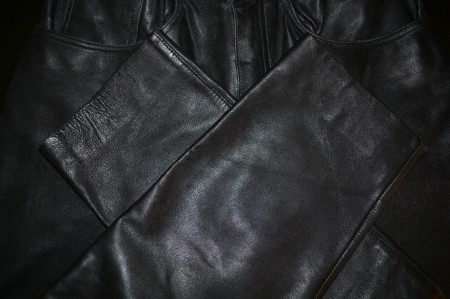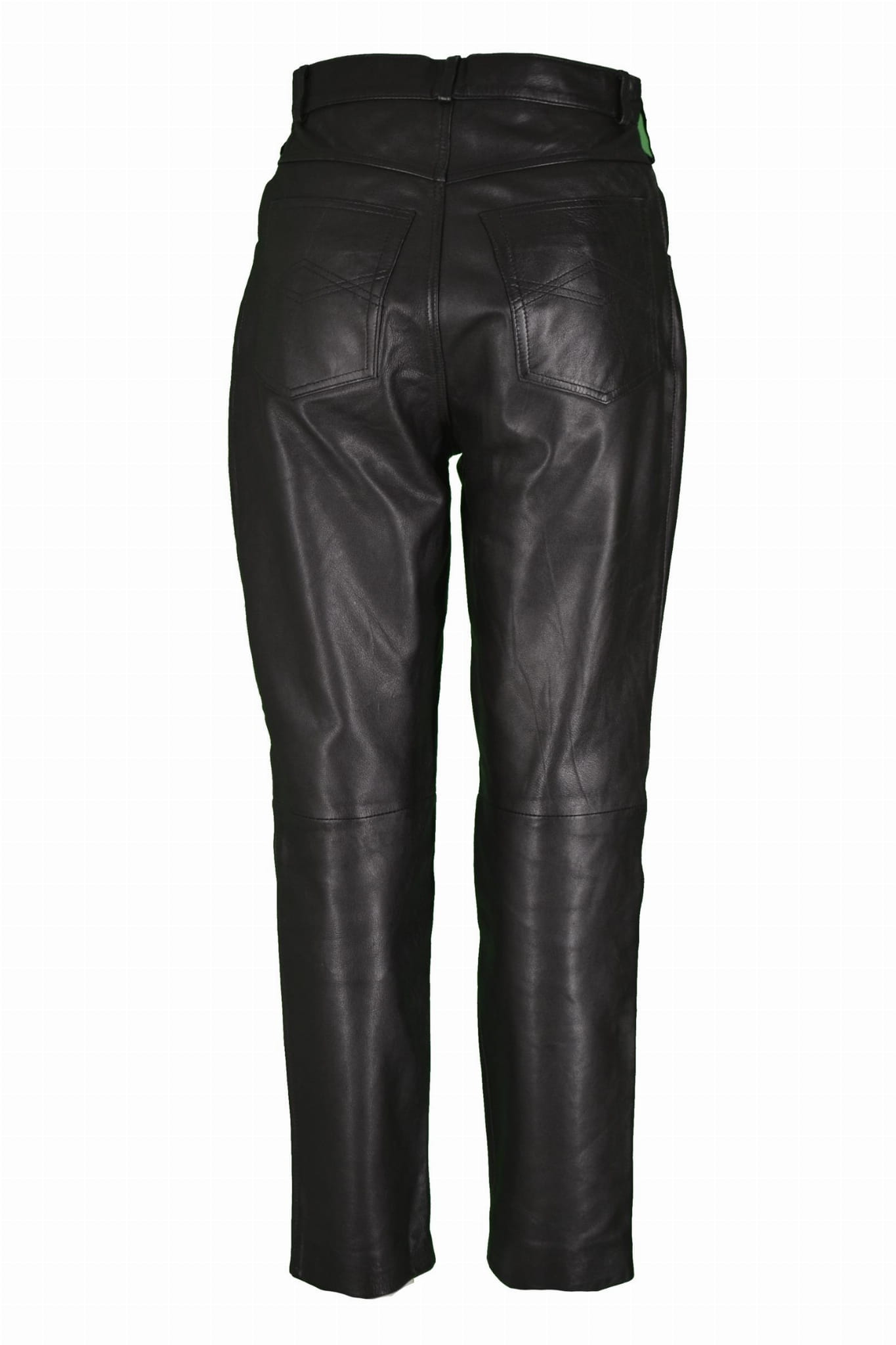 Używane, damskie spodnie skórzane w rozmiarze 36/S. Klasyczne proste spodnie ze skóry naturalnej bez protektorów, posiadają drobne ślady używania.