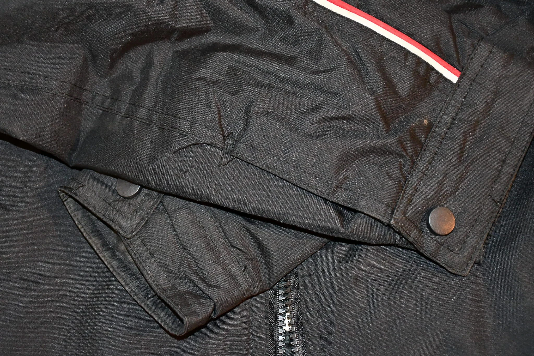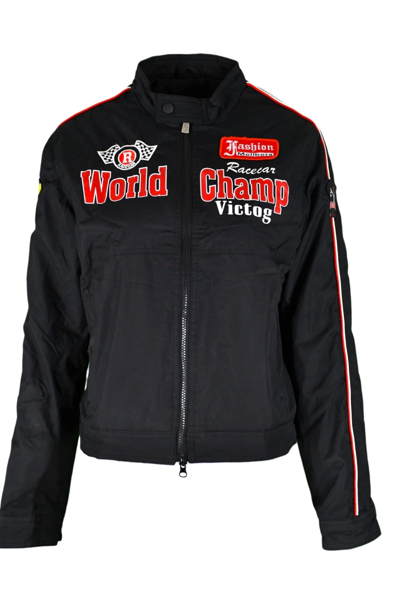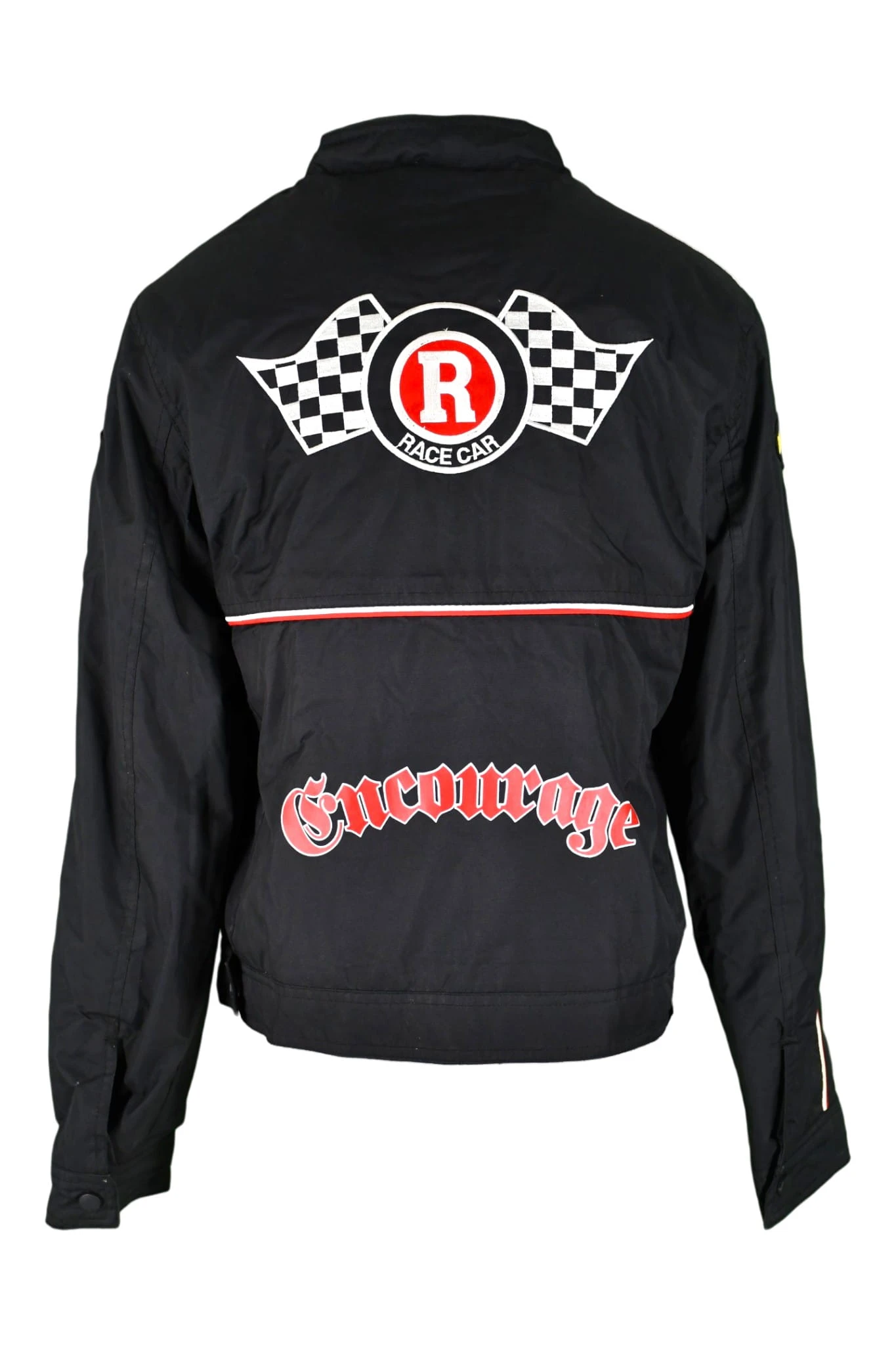 Używana kurtka tekstylna dziecięca w stylu wyścigowym, zapewniająca wygodę i lekkość użytkowania. Wyposażona w dwie kieszenie zewnętrzne.