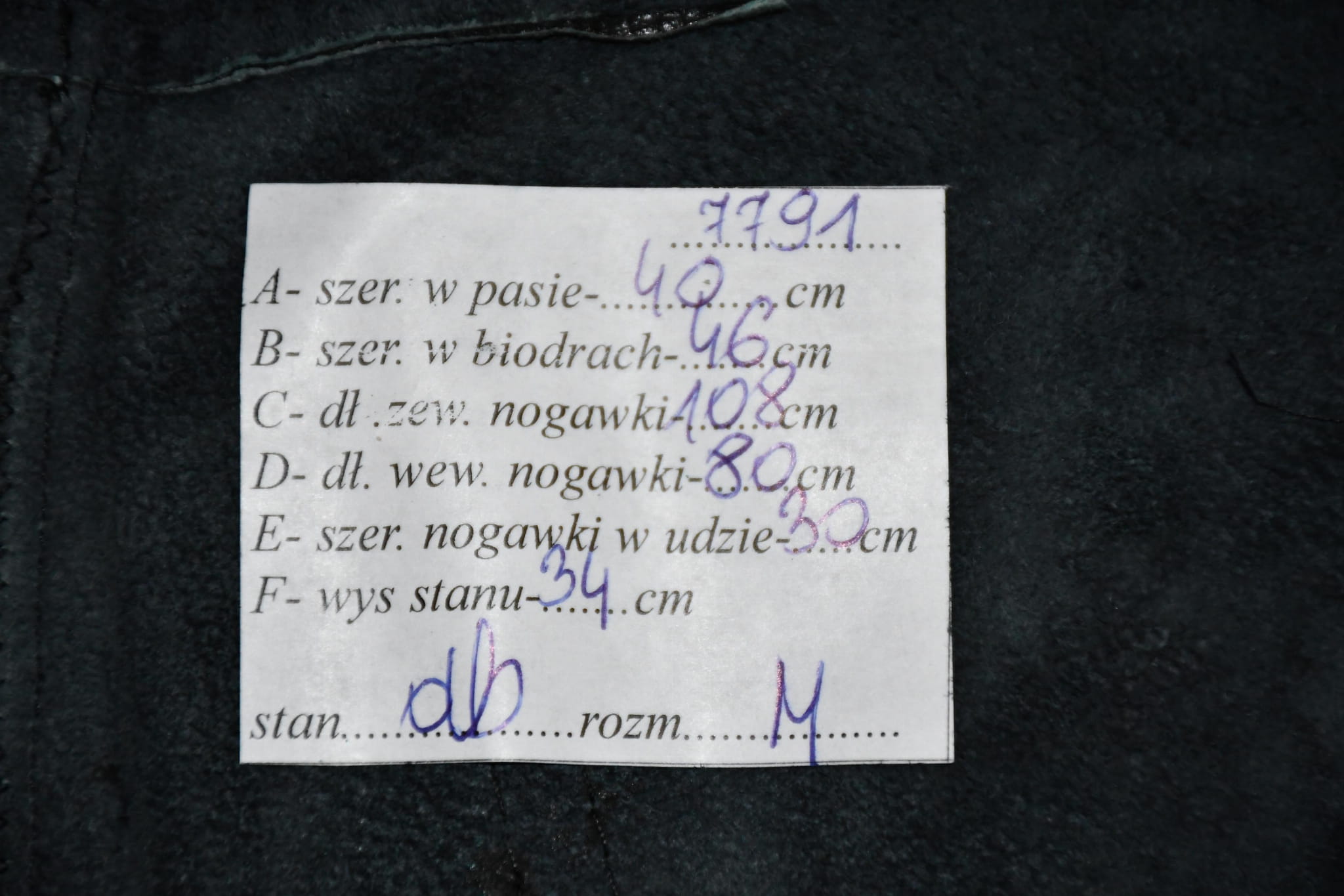 - stan dobry, miejscami drobne otarcia, ślady po przeszyciach na dole nogawek, brak podszewki (foto)